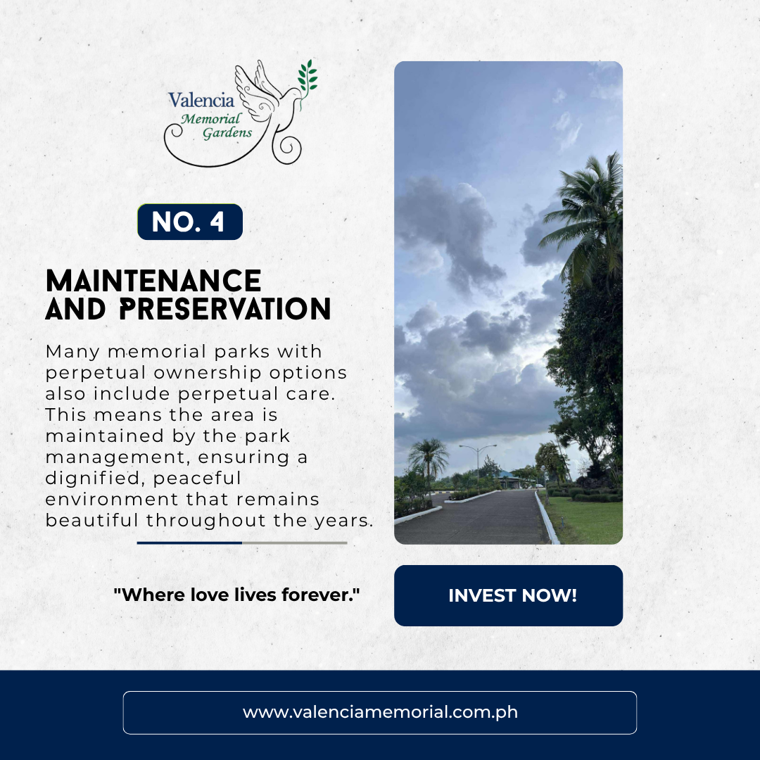 Many memorial parks with perpetual ownership options also include perpetual care. This means the area is maintained by the park management, ensuring a dignified, peaceful environment that remains beautiful throughout the years.